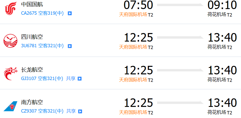 成都天府國際機場每天都有直飛張家界荷花機場的航班,具體參考如下: