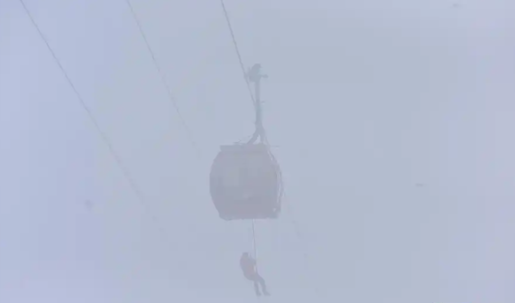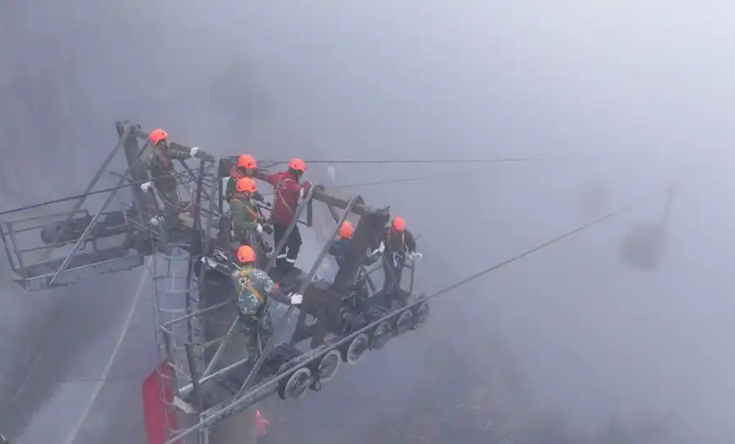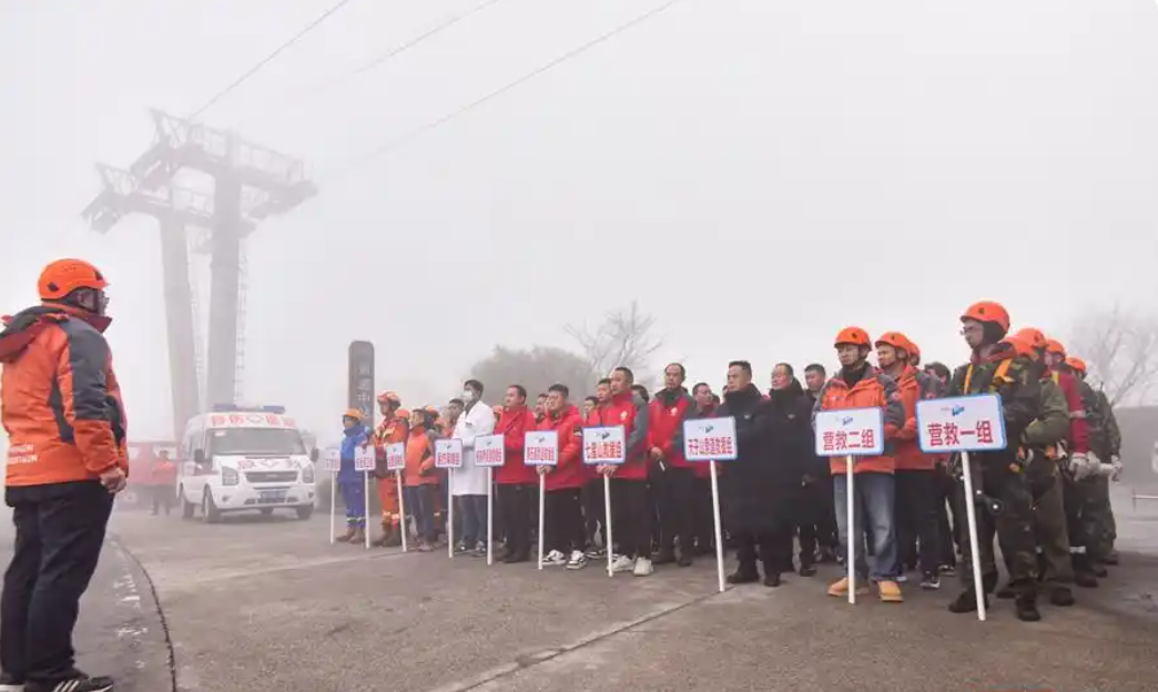 演習(xí)正式開(kāi)始,運(yùn)行中的天門山索道突然停止,模擬轎廂中的乘客被困。今日山頂飄雪,演習(xí)現(xiàn)場(chǎng)大霧彌漫,能見(jiàn)度極低,這為救援行動(dòng)增添了額外的難度和緊迫感。雖然現(xiàn)場(chǎng)氣溫接近0°,但救援人員已經(jīng)大汗淋漓。