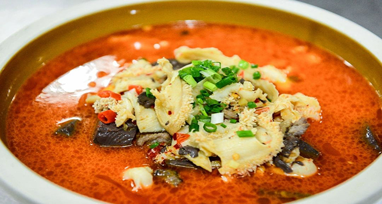 新化三合湯是新化人招待客人的必備佳肴,這道菜肴以其獨(dú)特的麻、辣、鮮、香而聞名遐邇。三合湯選用母水牛的血、厚實(shí)的公牛肚及母黃牛里脊肉為主料,經(jīng)過猛火熱油翻炒后,加入米醋、生姜、紅椒粉調(diào)味,再與稍炒的牛血匯合,加沸水烹煮成湯。最后,撒上蔥花、香菜,淋上山胡椒油,一碗熱氣騰騰、香氣四溢的三合湯便呈現(xiàn)在眼前。湯色紅亮,牛肉鮮嫩,牛肚脆爽,牛血滑嫩,三者合一,口感層次豐富,令人回味無窮。