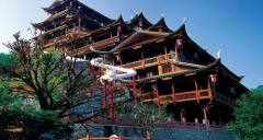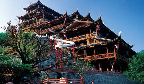 九重天世襲堂是土家風情園的精華和靈魂所在。該建筑由土家民間藝人李宏進設計,依80度陡坡而建,高48米,共9重12層,整個樓房全部用木栓連接,沒有一顆鐵釘,堪稱土家族建筑史上的奇跡。2002年9 月22日,九重天吊腳樓被載入世界吉尼斯世界紀錄,認定其為目前中國最大、最高、最完美的木質(zhì)結(jié)  土家風情園構(gòu)吊腳樓。