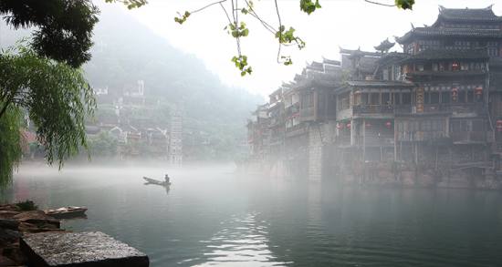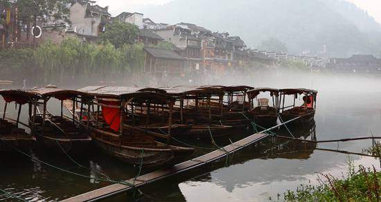 沱江河是古城鳳凰的母親河,她依著城墻緩緩流淌,世世代代哺育著古城兒女。坐上烏蓬船,聽(tīng)著艄公的號(hào)子,看著兩岸已有百年歷史的土家吊腳樓,別有一番韻味。順?biāo)拢┻^(guò)虹橋一幅江南水鄉(xiāng)的畫(huà)卷便展現(xiàn)于眼前:萬(wàn)壽宮、萬(wàn)名塔、奪翠樓……一種遠(yuǎn)離塵世的感覺(jué)悠然而生。沱江的南岸是古城墻,用紫紅沙石砌成,典雅不失雄偉。城墻有東、北兩座城樓,久經(jīng)滄桑,依然壯觀?! °铀宄海菈叺暮拥篮軠\,水流悠游緩和,可以看到柔波里招搖的水草,可以撐一支長(zhǎng)篙漫溯。沿沱江邊而建的吊腳樓群在東門(mén)虹橋和北門(mén)跳巖附近,細(xì)腳伶仃的立在沱江里,象一幅永不回來(lái)的風(fēng)景。