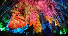 白龍洞發(fā)育于距今2.25億年的三疊紀(jì)白去質(zhì)石灰?guī)r,溶洞內(nèi)千奇百怪的石筍、石花、石柱、石幔、石簾等均是由于水和二氧化碳的緩慢侵蝕和積聚創(chuàng)造出來(lái)的杰作,漸漸形成了這千姿百態(tài)、光怪陸離的洞內(nèi)奇觀。